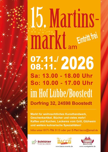 Als Veranstalter laden wir seit 15 Jahren nach Boostedt ein, wo es im März "Frühjahrsmarkt" sowie im November "Martinsmarkt" heißt!